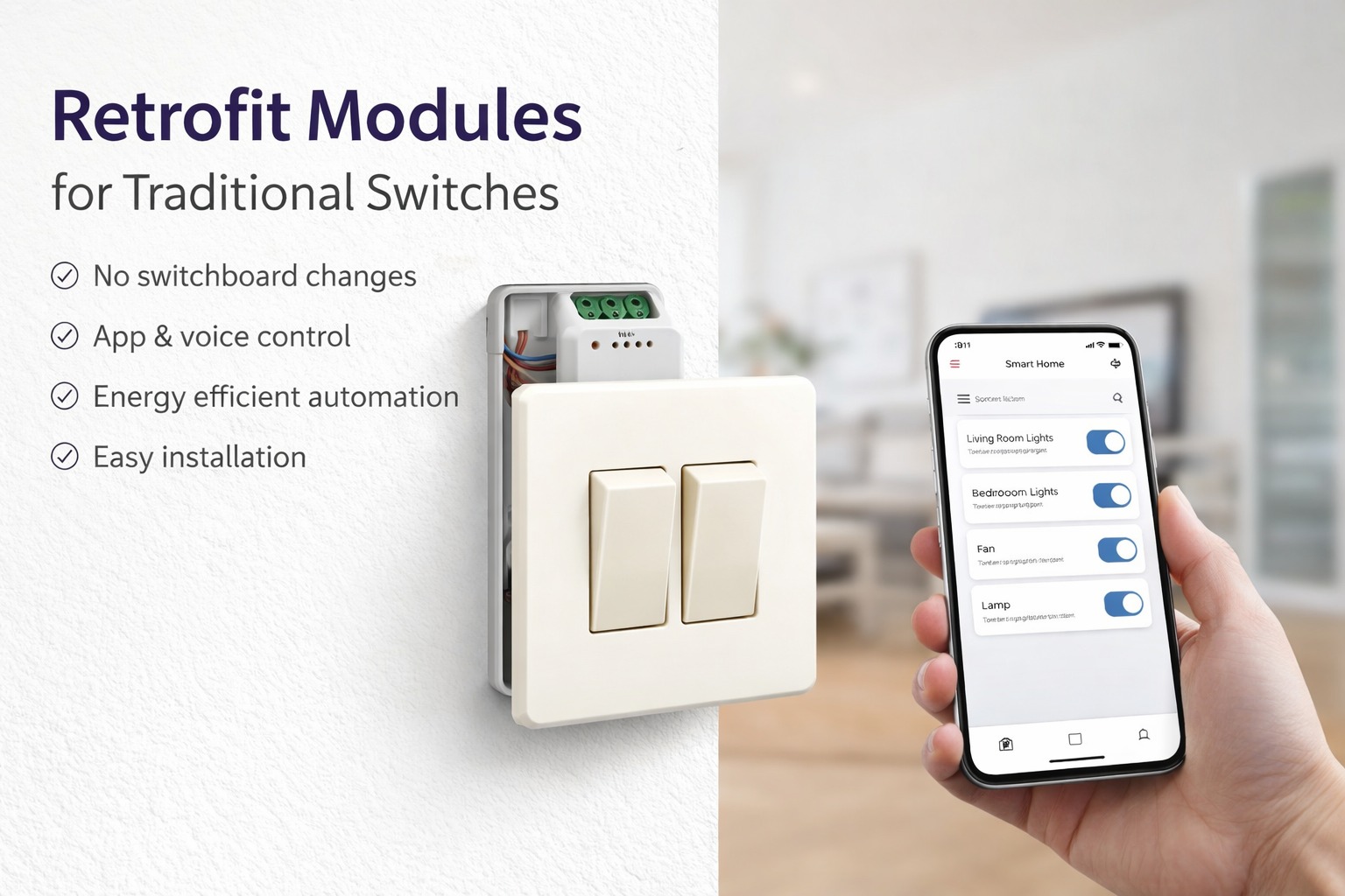 Retrofit modules are compact smart devices that fit behind traditional electrical switches and convert them into intelligent, app-controlled switches. They allow users to enjoy modern smart features while retaining the familiar look and feel of conventional switchboards.